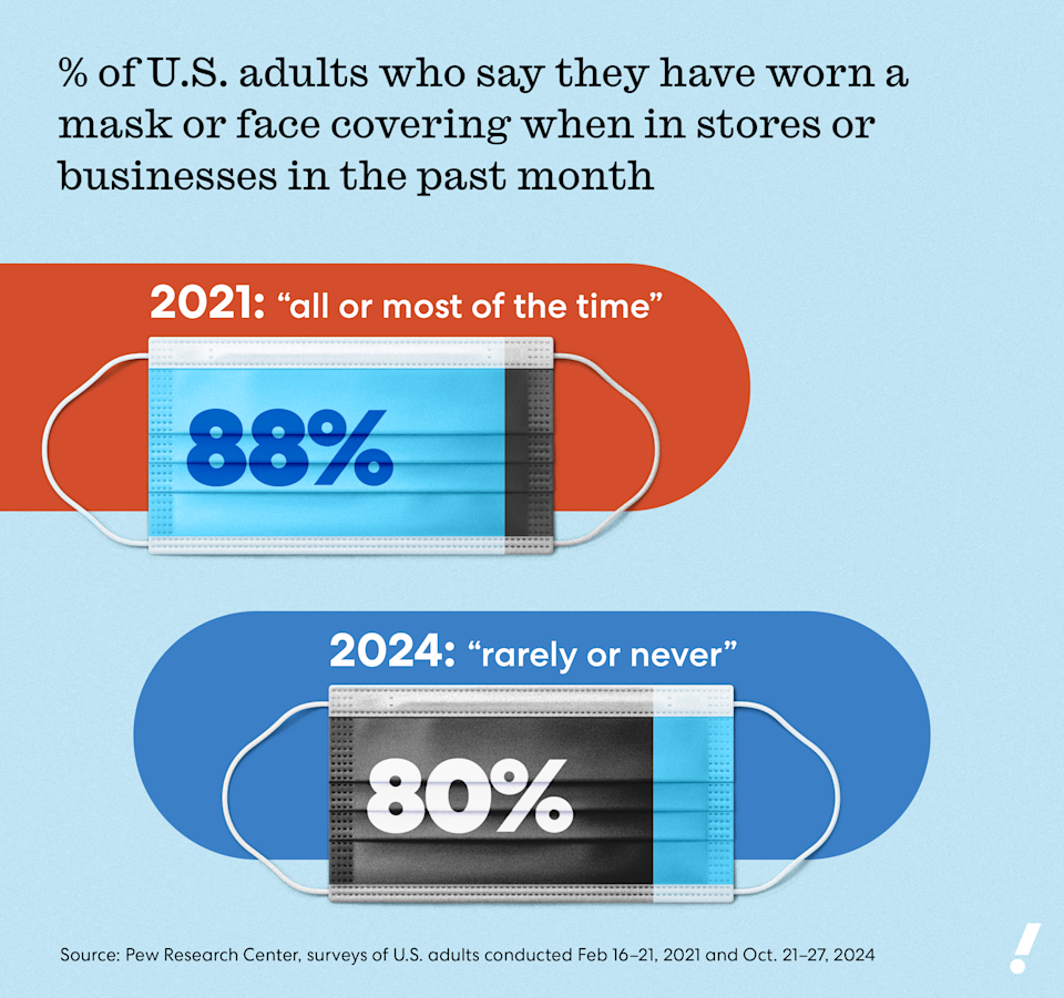 Still, recent polling from the Pew Research Center reveals that while mask-wearers are still out there, they are few and far between — and their numbers have plummeted since the beginning of the pandemic. According to Pew, 80% of Americans say they rarely or never wear a mask in stores or businesses. Four years ago, those numbers were reversed, with 88% of Americans saying they had worn a mask or face covering in stores all or most of the time in the past month.