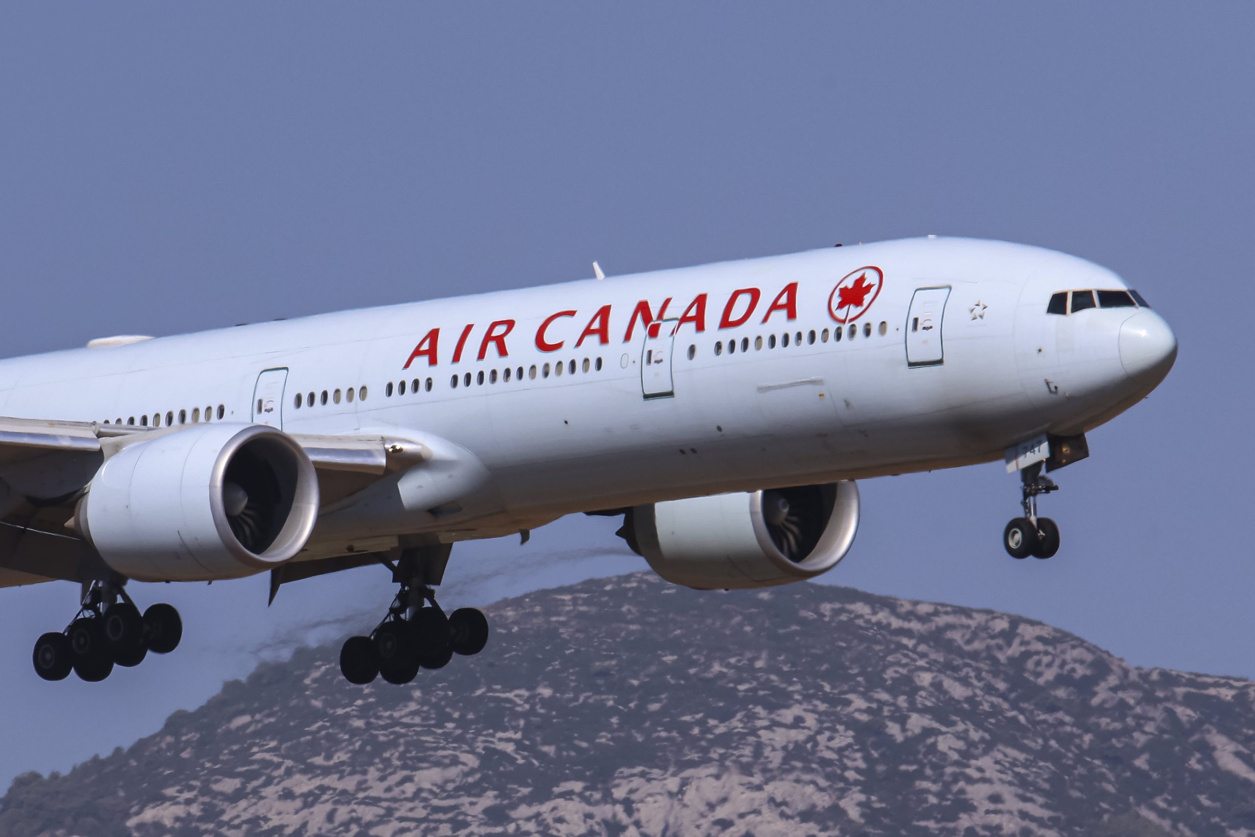Air Canada Boeing 777-300ER passenger aircraft spotted flying on final approach for landing on the runway of Athens International Airport Eleftherios Venizelos at the Greek capital.