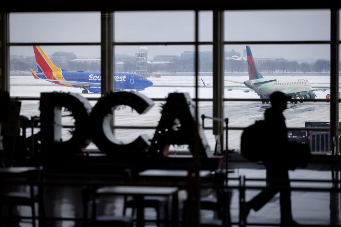 Airplanes on the tarmac during a snow storm at Ronald Reagan Washington National Airport in Arlington, Virginia, US, on Monday, Jan. 6, 2025.
