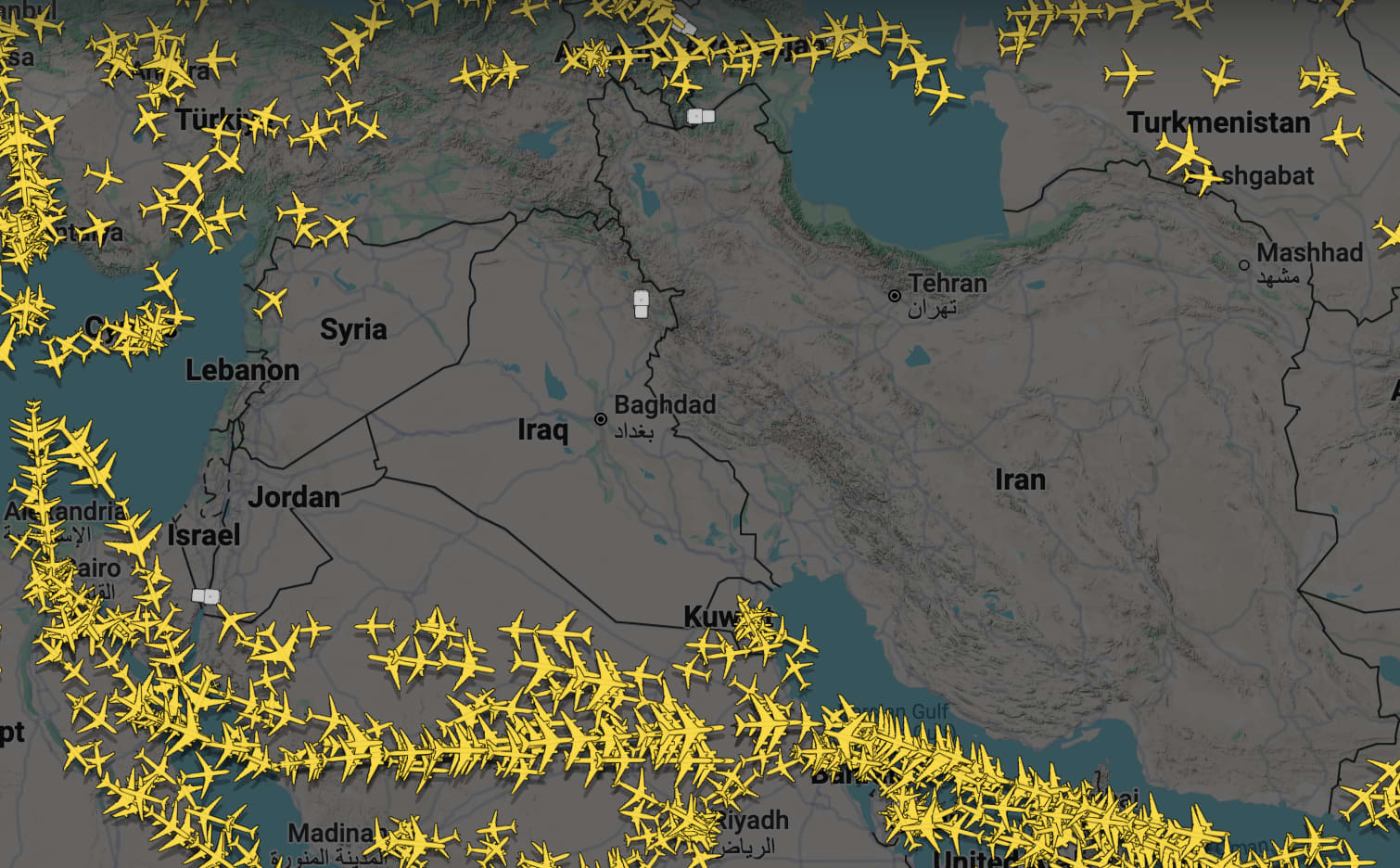 Flight map over the Middle East as Iran launches retaliatory attacks on Israel at 19:19 UTC on June 13th, 2025.