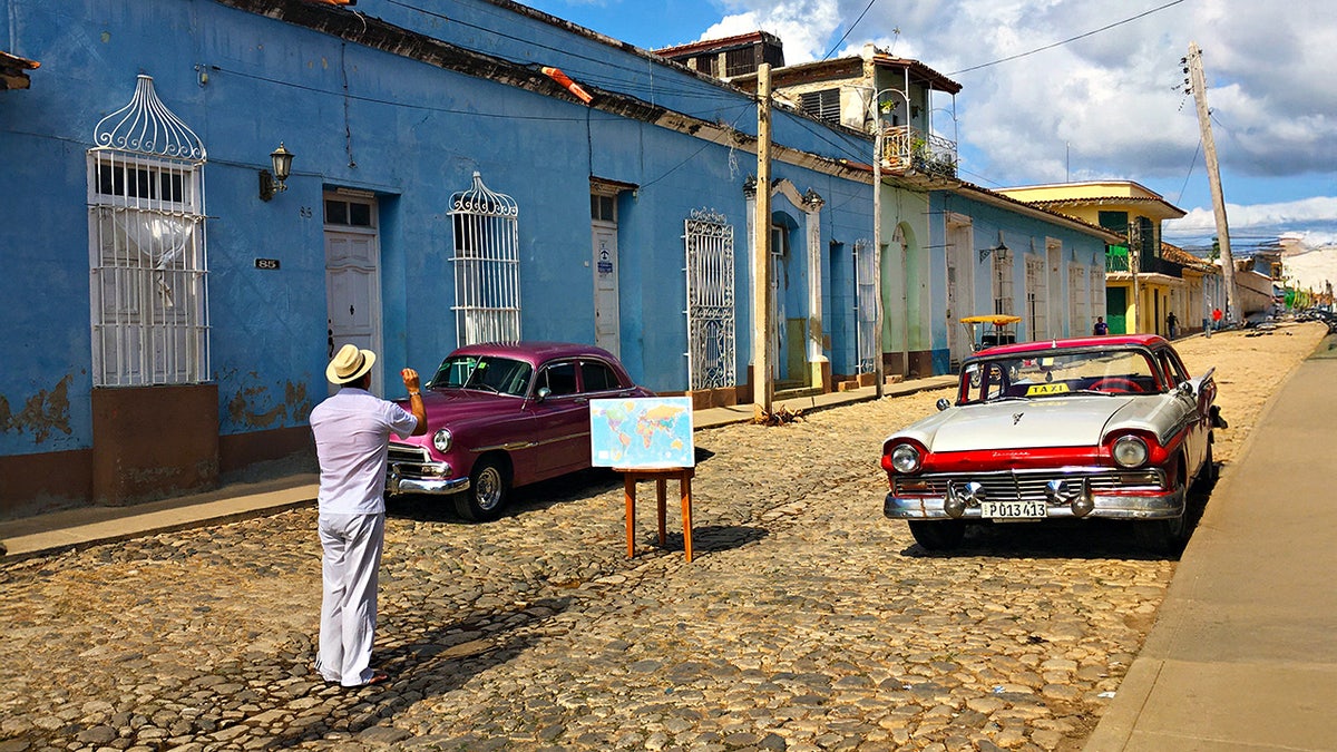 Sorin Mihailovici throwing a dart in Cuba. A man has travelled to over 60 countries by throwing a dart a world map and visiting where ever it lands.