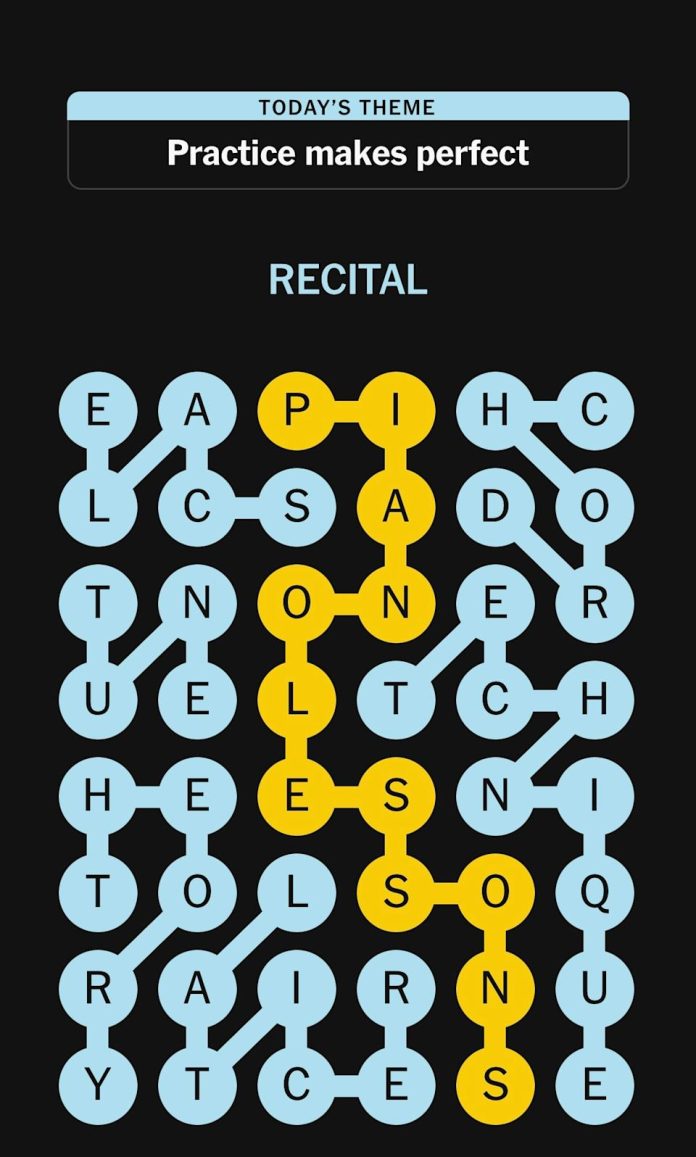 I started off searching for words you can practice, such as sports or music. I found PIANO first, but I didn’t link it to LESSONS until after I spotted CHORD. Even though I grew up playing piano, I did have to use a hint for the last two words: RECITAL and THEORY. Safe to say, piano was never my strong suit.